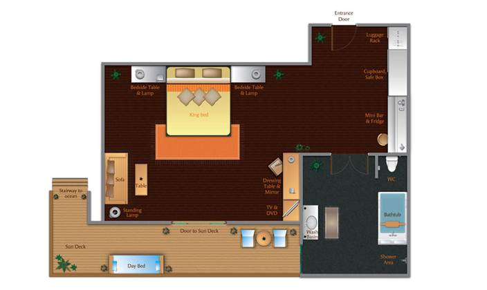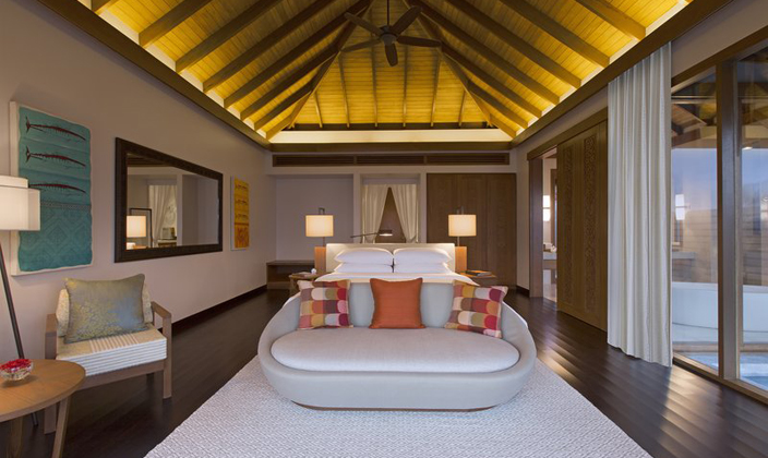 这些田园诗般的浪漫水上度假小屋正对着碧蓝泻湖。从您的甲板直接跃入下方蓝色大海,或在您的私人跳水池里畅游一番。珍惜在水上静居度过的每个亲密瞬间,尽享无敌美景和现代感性设计。 豪华水上泳池度假小屋拥有125平方米宽敞空间,将安纳塔拉招牌舒适与从本地汲取灵感的设计完美融合,您期待的所有舒适都在其中。在您宽敞的卧室内休息,硬木地板倍添时尚风格。在铺着精美床单的特大双人床上酣然入睡。从您的私人客房内吧台取瓶饮料,在室外日光躺椅上倾听iPod播放的旋律,欣赏眼前蓝宝石般海水与无尽蓝天在远方连成一线。